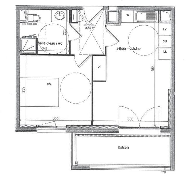 Il se compose d'une entrée, un pièce de vie avec cuisine, une chambre, une salle d'eau avec Wc.
