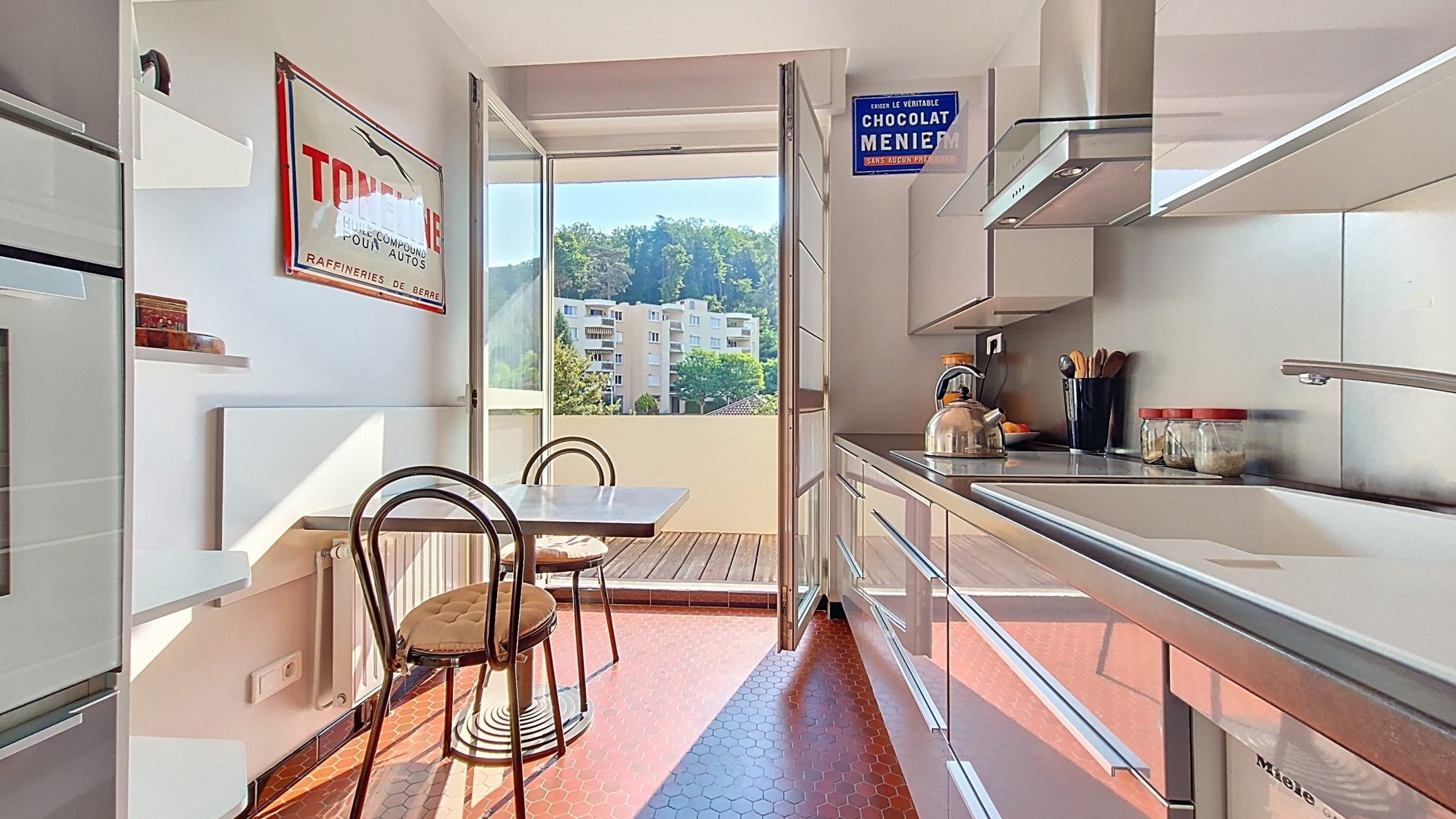La cuisine séparée et équipée, orientée Est, s’ouvre sur un second balcon de 10,9 m² : un véritable prolongement extérieur pour vos petits-déjeuners, votre coin lecture ou même un potager urbain.
