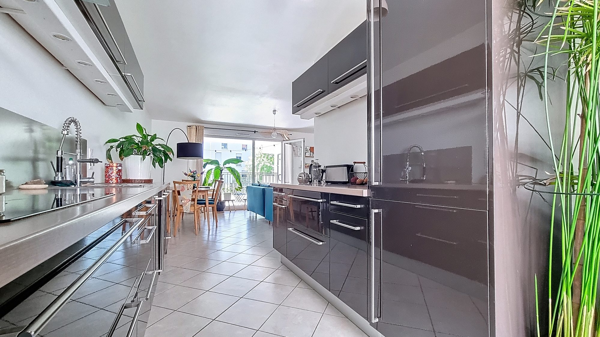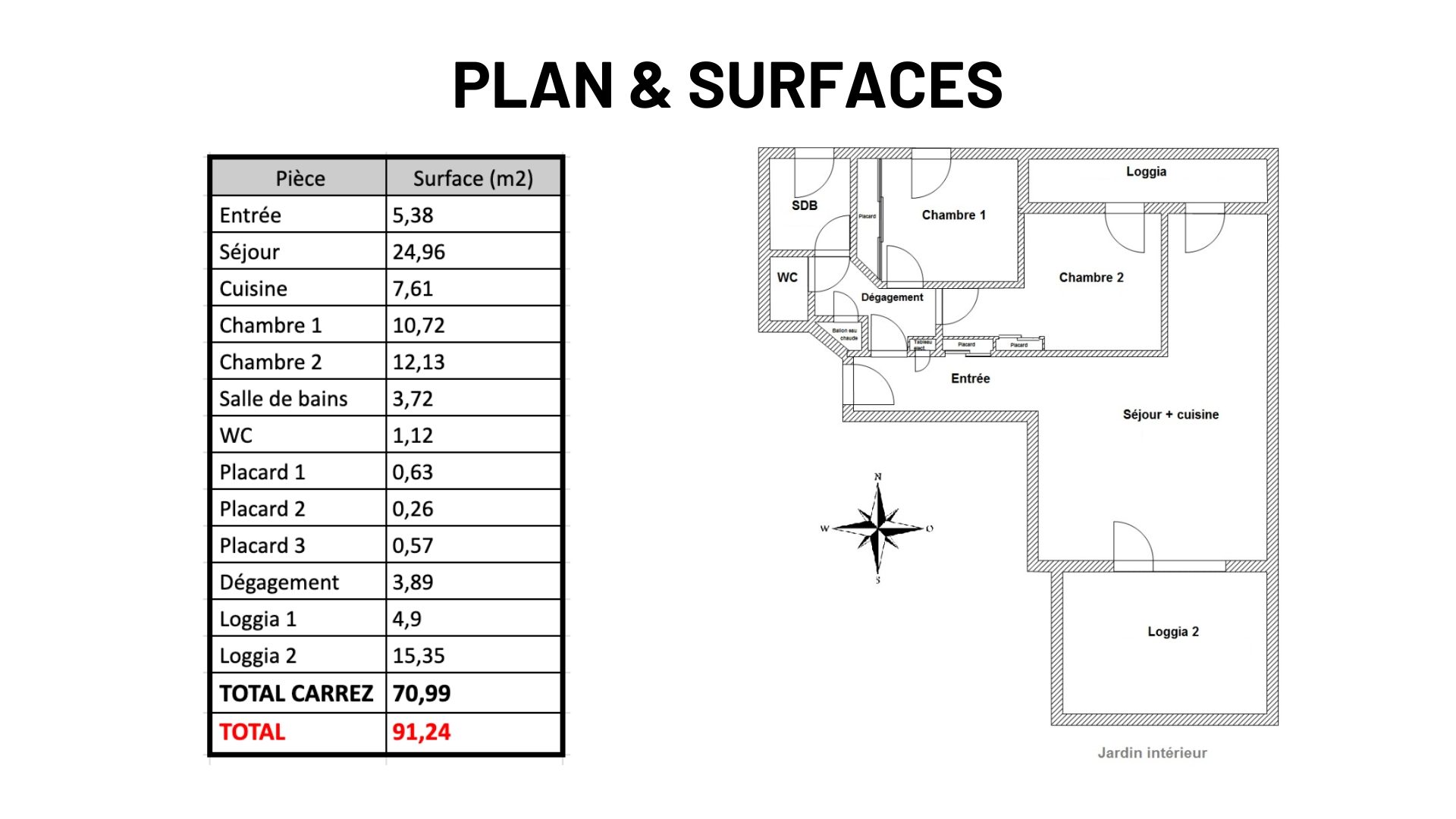 Surface totale de 70,99m² Carrez avec un spacieux séjour traversant Nord-Sud et cuisine aménagée équipée ouverte de 32m², 2 chambres, salle de bains rénovée et WC séparés. Profitez de 2 extérieurs avec un balcon sur rue de 5m² et d'une grande loggia de 15m² au calme donnant sur le jardin de copropriété.