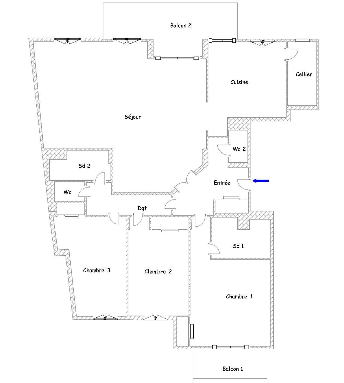 L'appartement est lumineux, il se compose d'une entrée, un salon séjour double, une cuisine, 3 chambres, 2 salles d'eau, un dégagement, 2 toilettes
