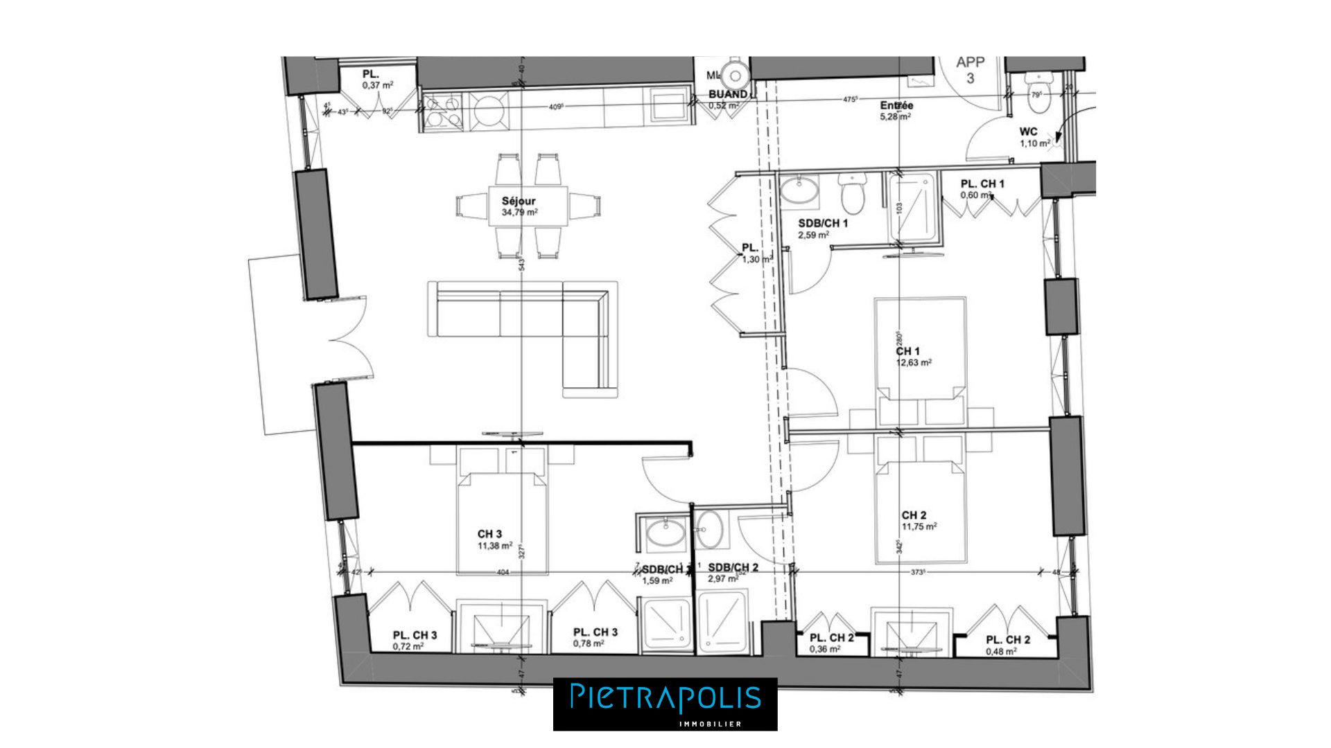 • Plan optimisé : vaste séjour avec cuisine américaine à aménager selon vos envies ouvrant sur un balcon, trois belles chambres chacune dotée de sa salle d’eau contemporaine et placard, et WC séparés et buanderie.