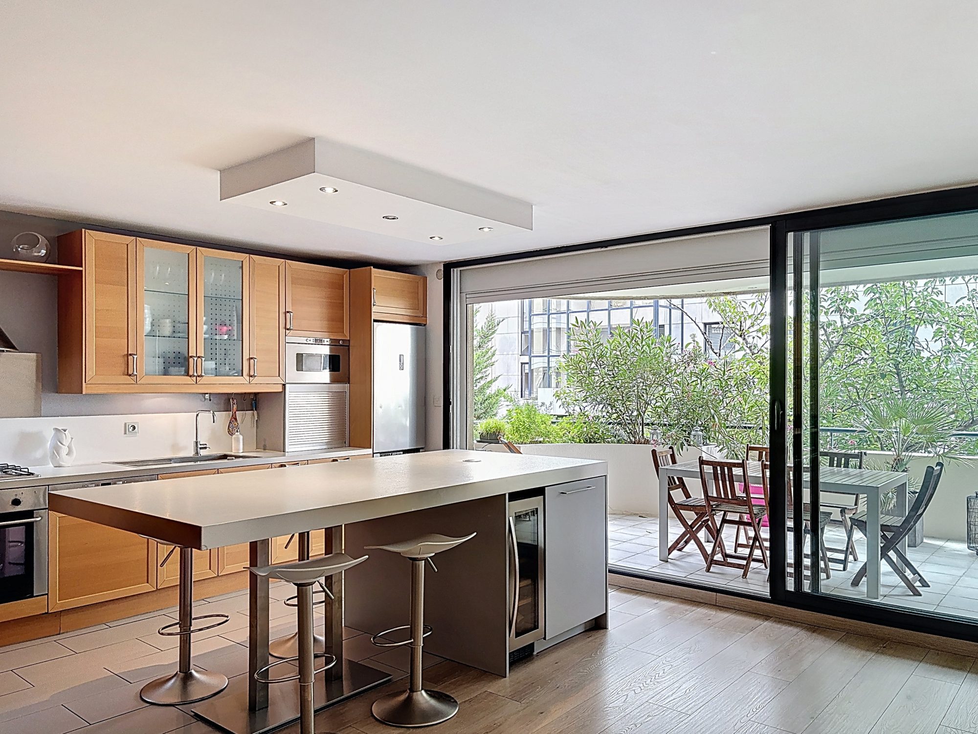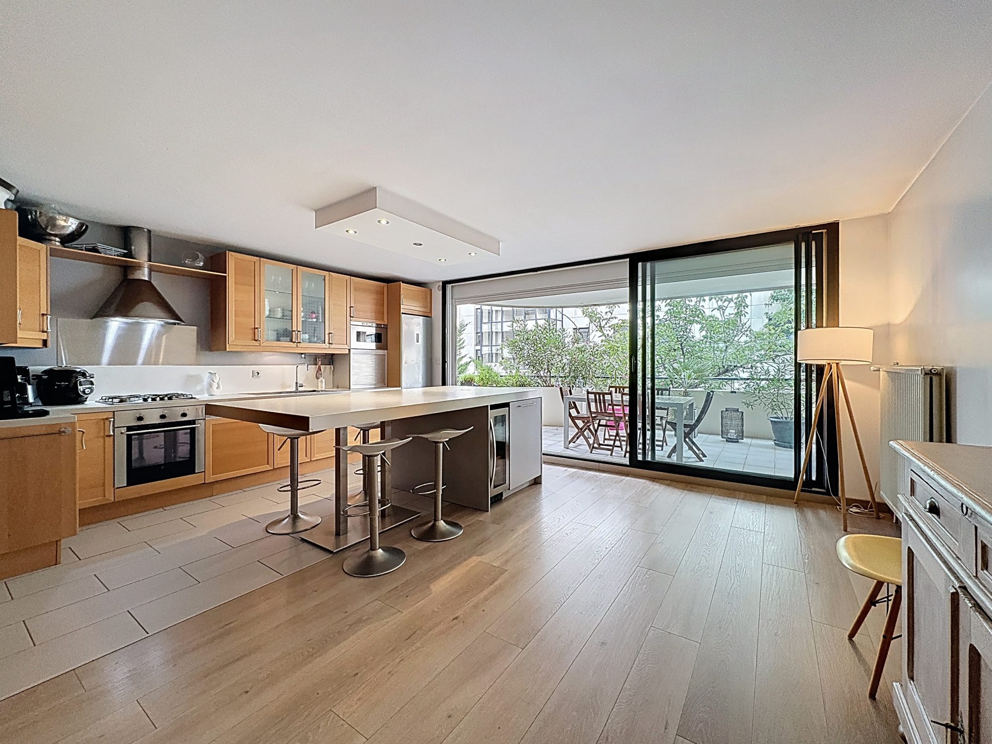 En exposition Sud, la grande pièce de vie de 41 m² s’ouvre sur la terrasse dinatoire de 18 m².