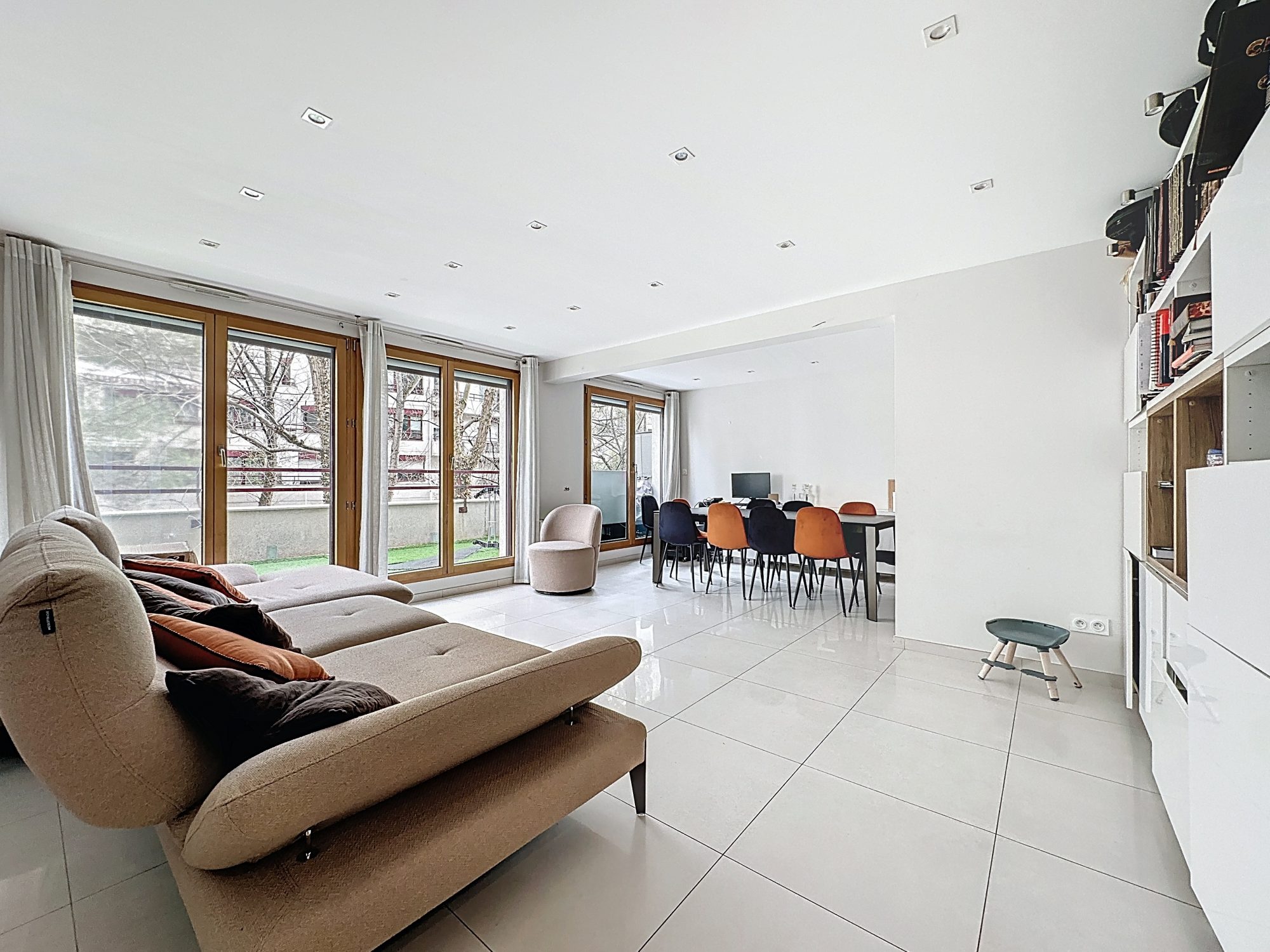 L'entrée, avec placards et buanderie, dessert une cuisine équipée – indépendante, ainsi qu'une grande pièce de vie de +30m2 exposée à l'est. L'ensemble donne accès à une terrasse de 20 m² sur cour intérieure arborée et verdoyante.