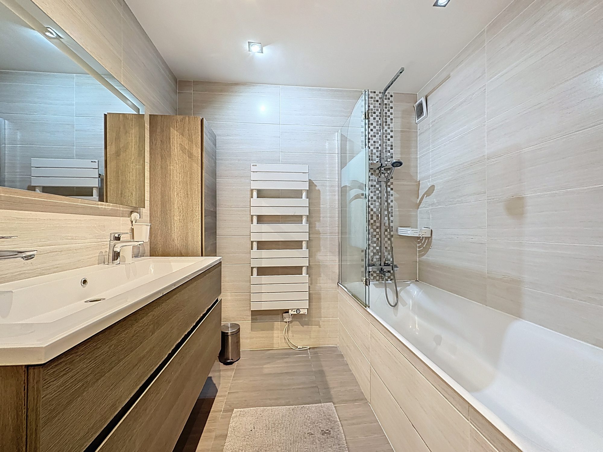 Le coin nuit donne accès à la salle de bain entièrement carrelée, aux WC indépendants et à trois chambres spacieuses.
