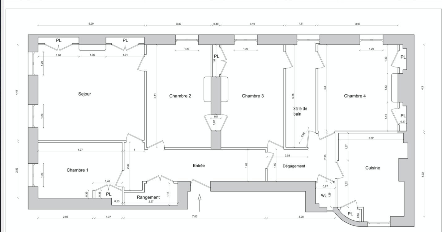L'appartement se compose de 5 pièces dont 4 chambres, une salle de bains, et des WC indépendants (second WC possible).