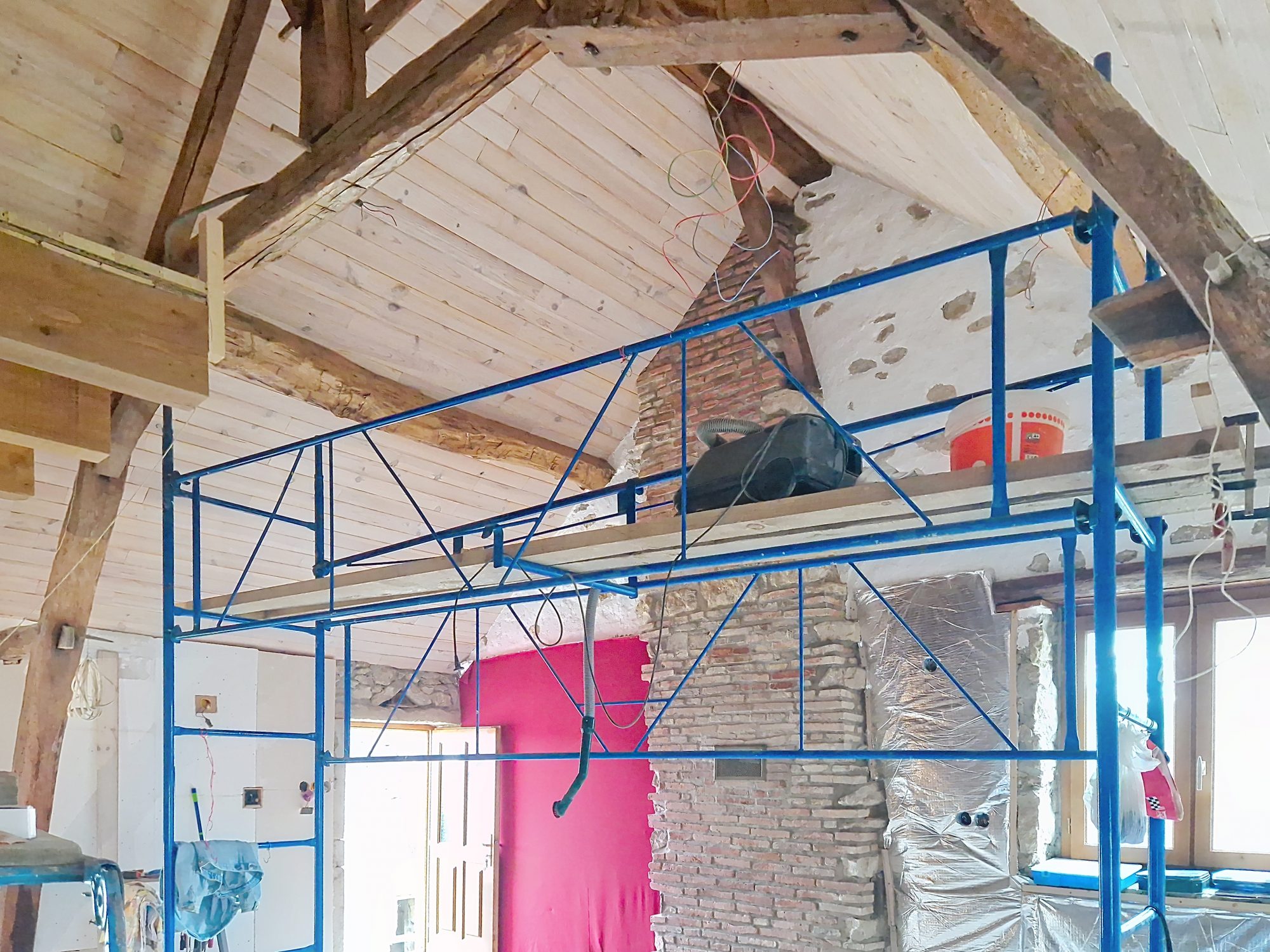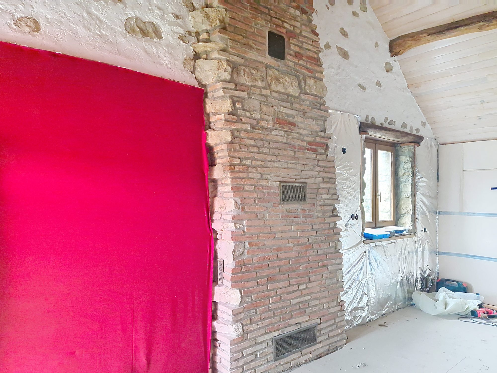 Cette ancienne ferme offre environ 90 m² au sol, répartis en trois grandes pièces de 30 m². De nombreuses ouvertures ont déjà été réalisées dans les murs porteurs, facilitant vos futurs aménagements.