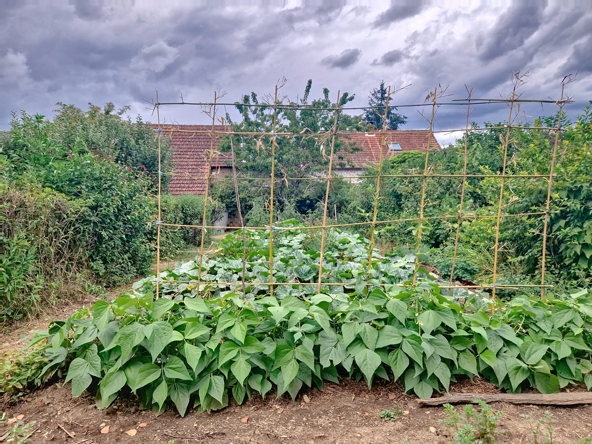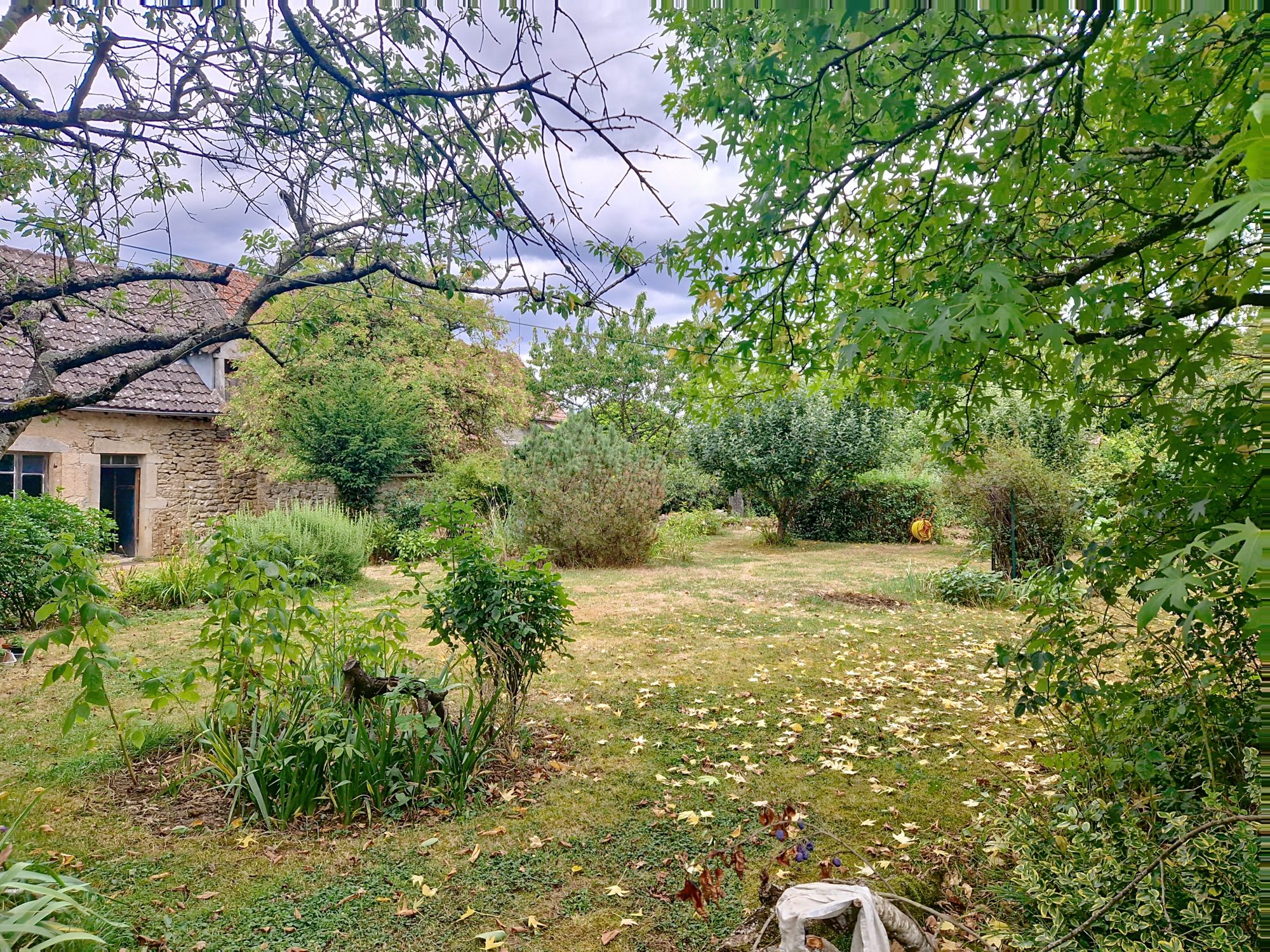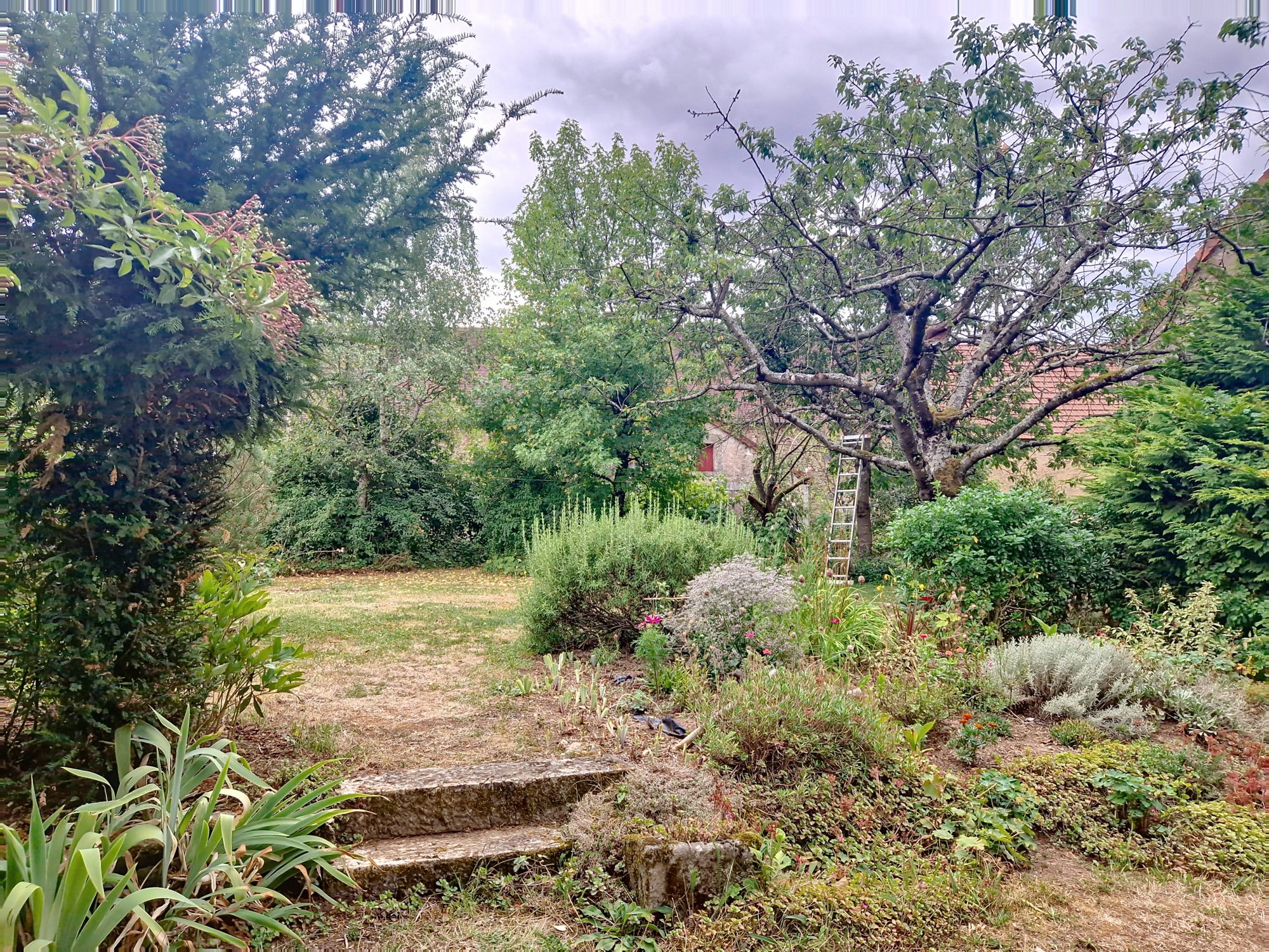 Le rez-de-chaussée s’ouvre sur un beau terrain plat, avec un potager d’un côté et des arbres au centre.