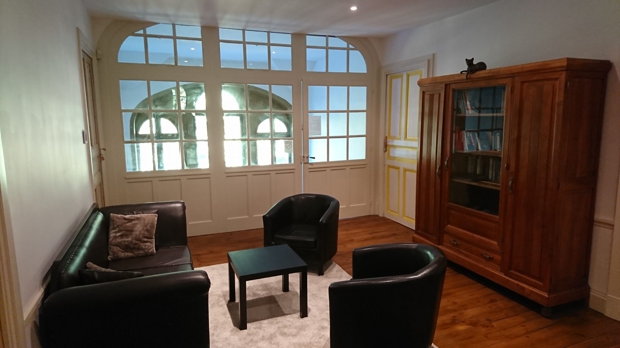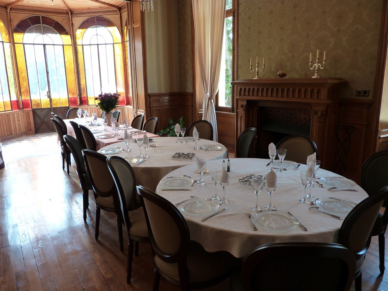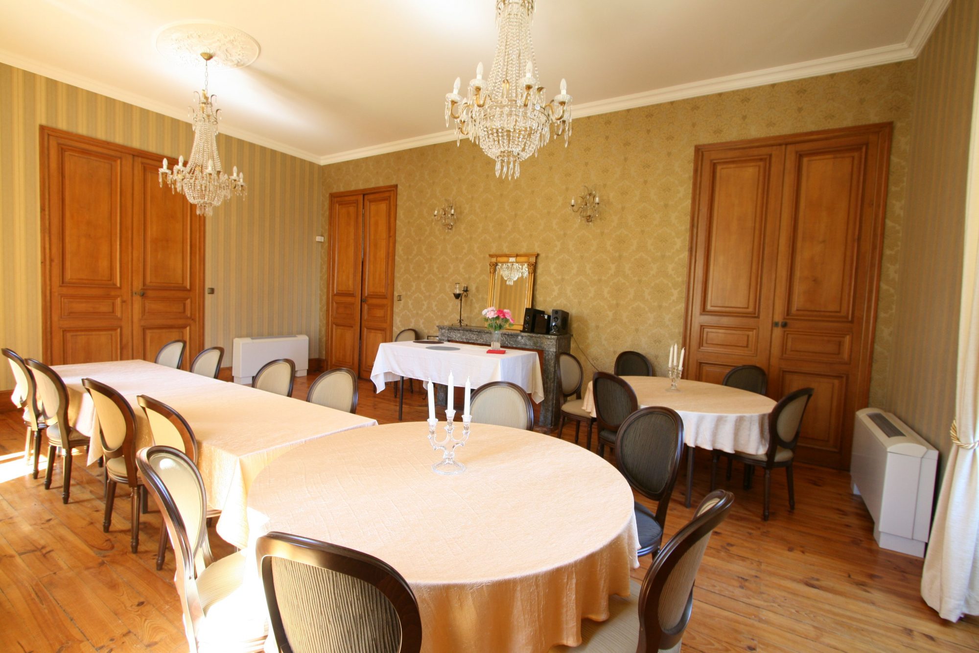 Au rez de chaussée vous découvrirez trois superbes salles de réceptions, avec des parquets et menuiseries d'époque, des cheminées séculaires, des plafonds à la française et un magnifique bow-window avec vue sur la piscine.