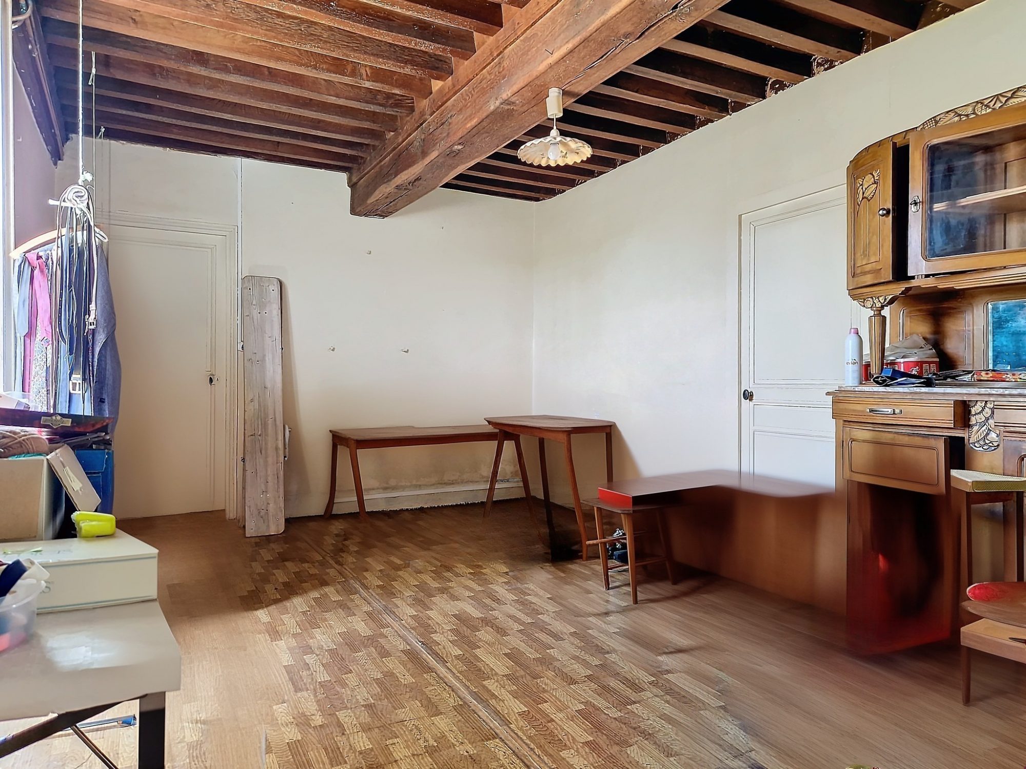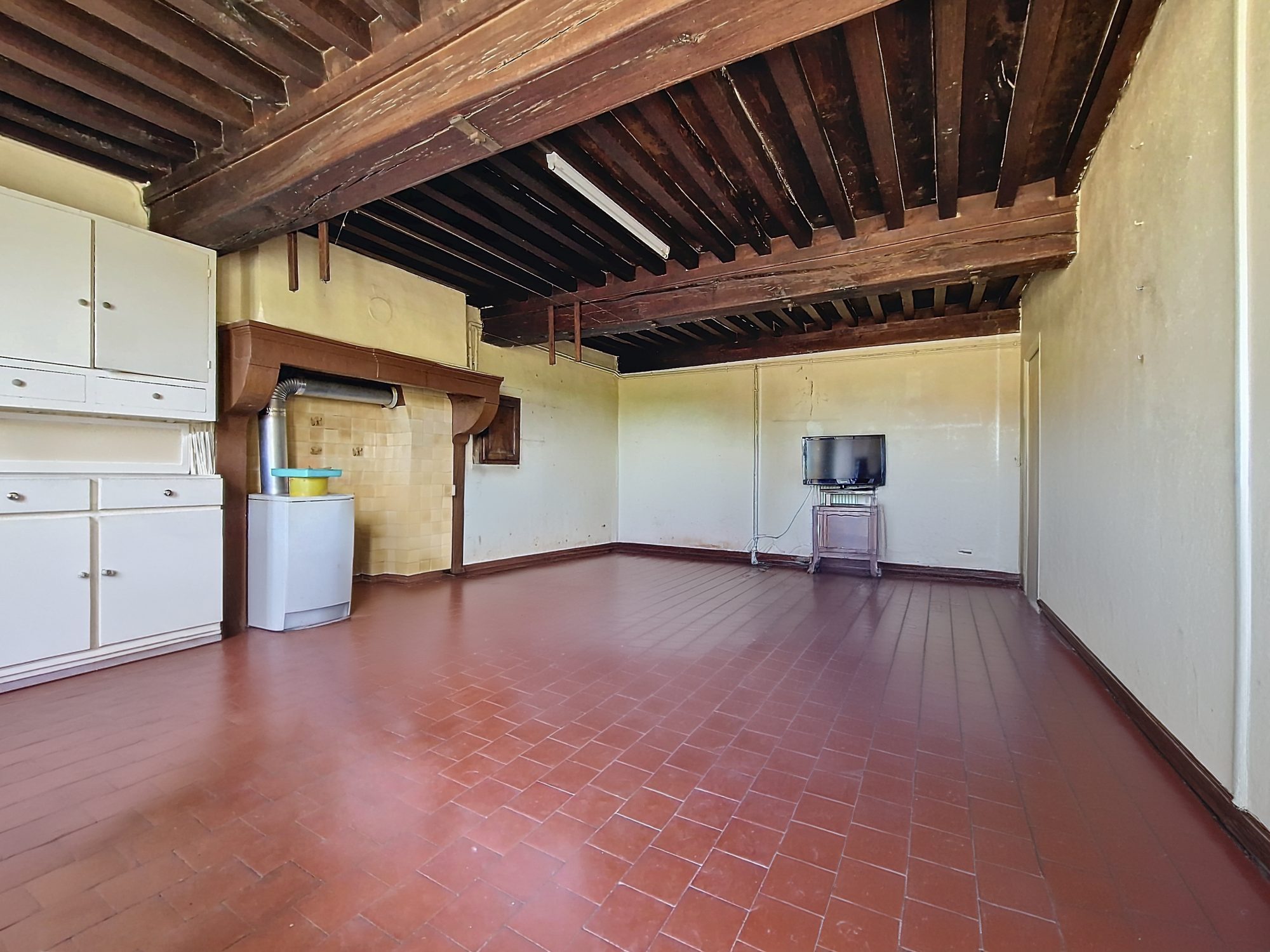 Une grande cuisine -séjour de 30 m², un salon de 19 m², 2 chambres (18 m² et 16 m²), une salle de bain, un wc séparé, un dégagement avec évier.