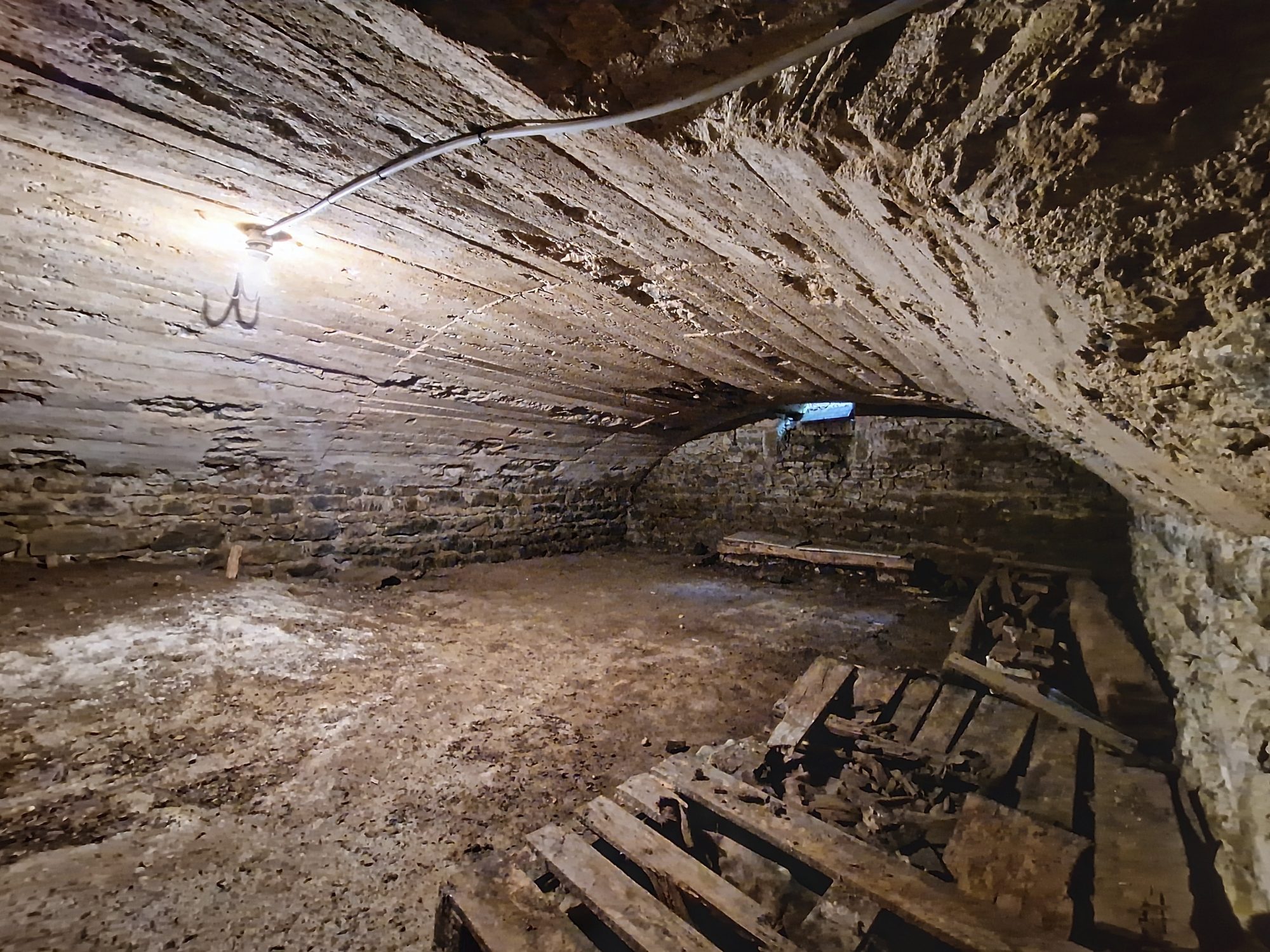Un cellier (environ 27 m²) avec escaliers permettant soit l'accès aux 2 caves (total 65m²), soit aux étages. Une porte donne accès au jardin situé à l'arrière de la maison.